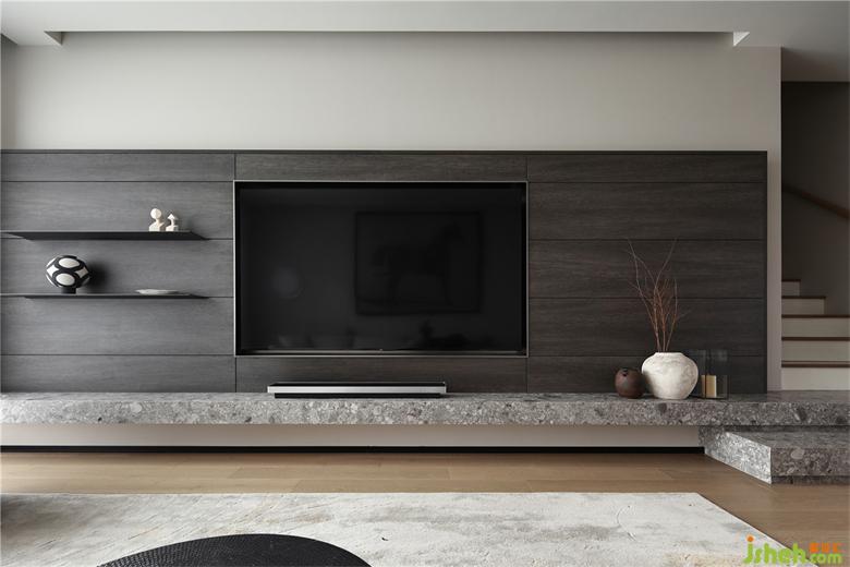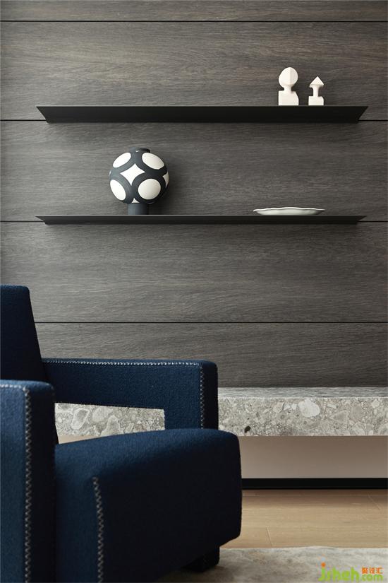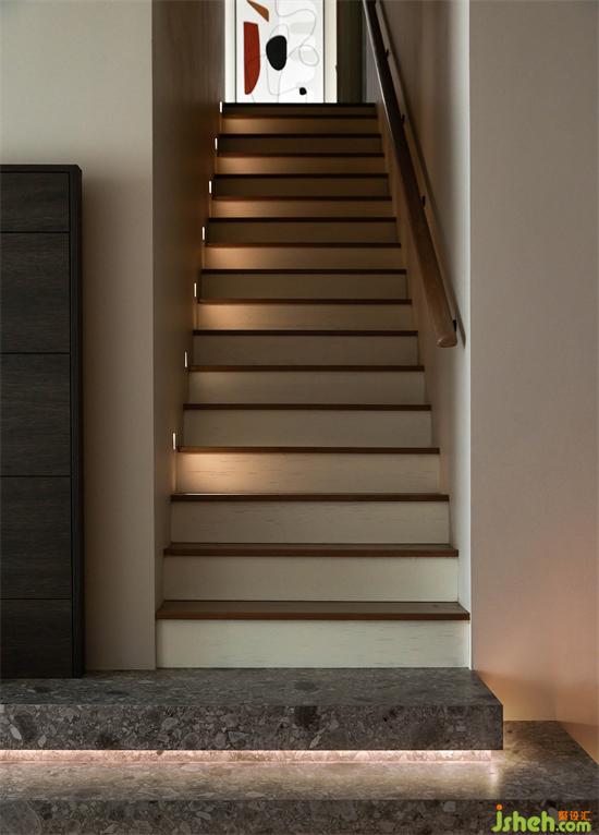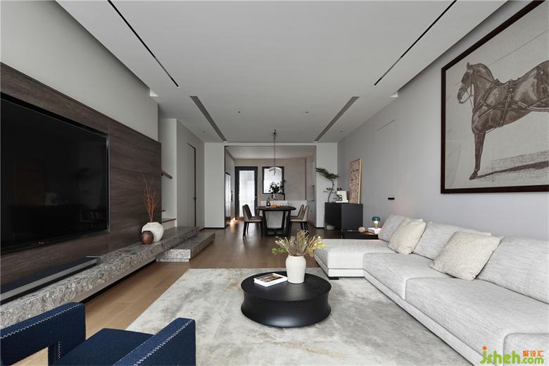 楼梯将空间划分为楼下的社交休闲空间和楼上的私人休息空间,公私空间有着明确的区分,互不干扰。抽象版画,麓湖芸台漫跃层装修设计以极简线条与图形的碰撞,呼应了整个空间的设计调性。