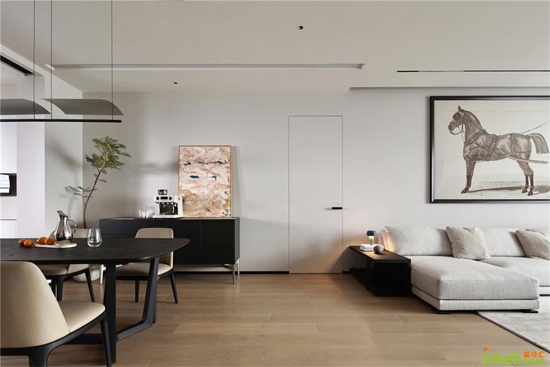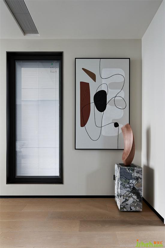 餐边柜上的艺术版画用斑驳的橙色为空间带了一抹亮色,活泼生动,麓湖芸台漫跃层装修设计中和了原有黑白空间的严肃感。隐形门的设置,让整个空间看上去更加整洁干净。