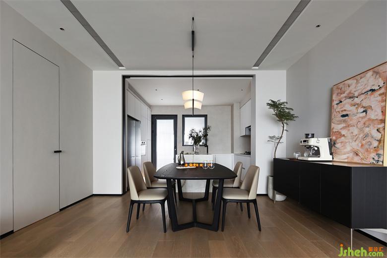 选用深色木质餐桌,质感十足,餐桌椅纤细的造型中和了深色带来的沉闷感,麓湖芸台漫跃层装修设计使整体空间不至过于沉闷。