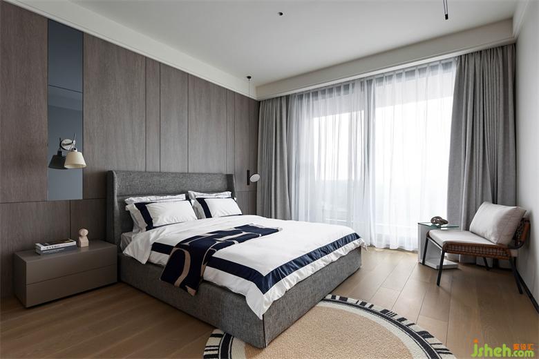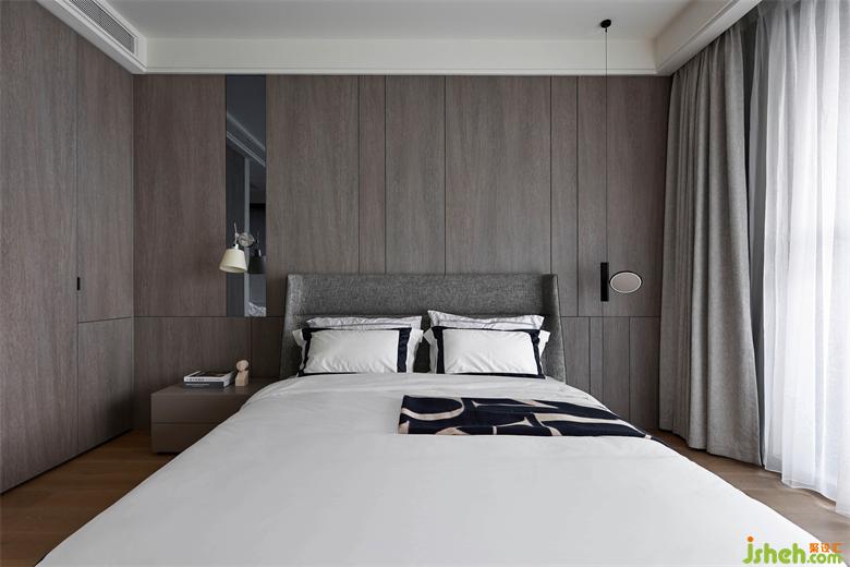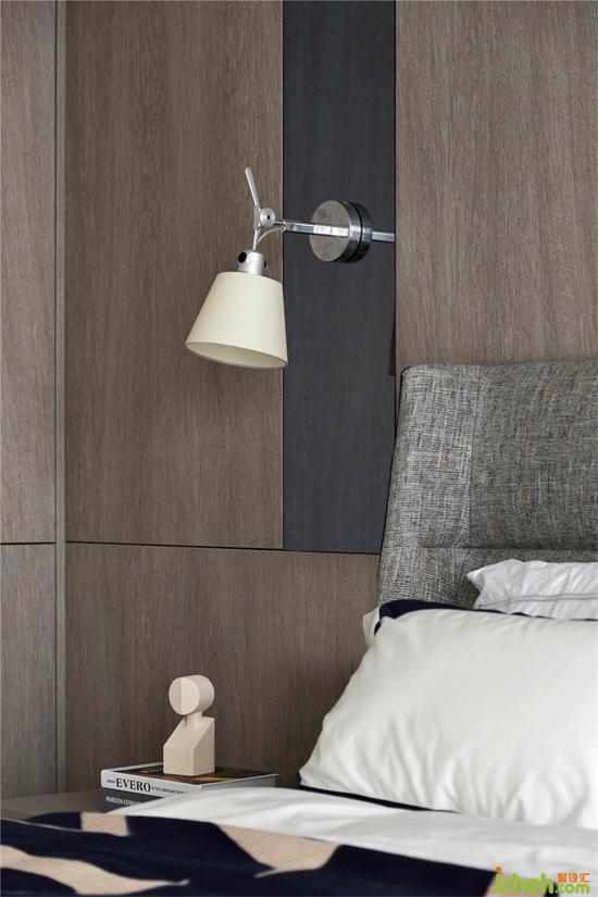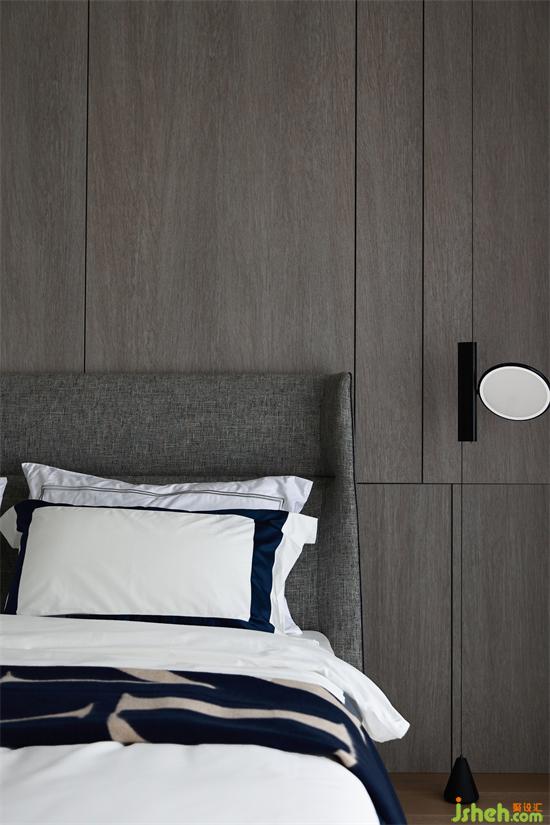 位于二楼的主卧是一个套房,便于居住者平日的生活起居。麓湖芸台漫跃层装修设计深灰木质墙面的装饰,营造出沉静安稳的睡眠环境,容易让人安下心来,卸下一整天的疲惫,沉浸在舒适的休憩之中。