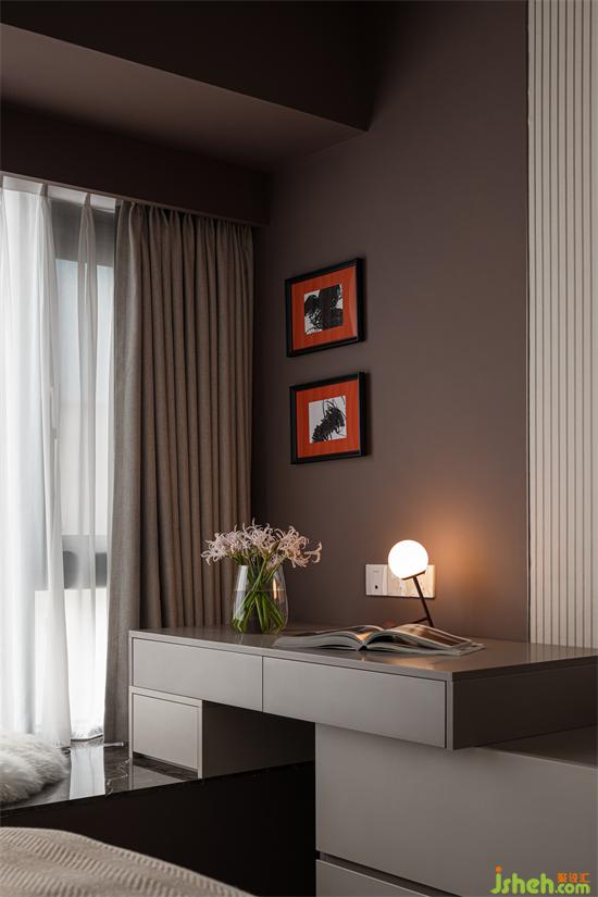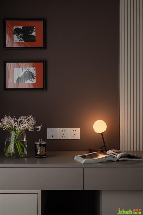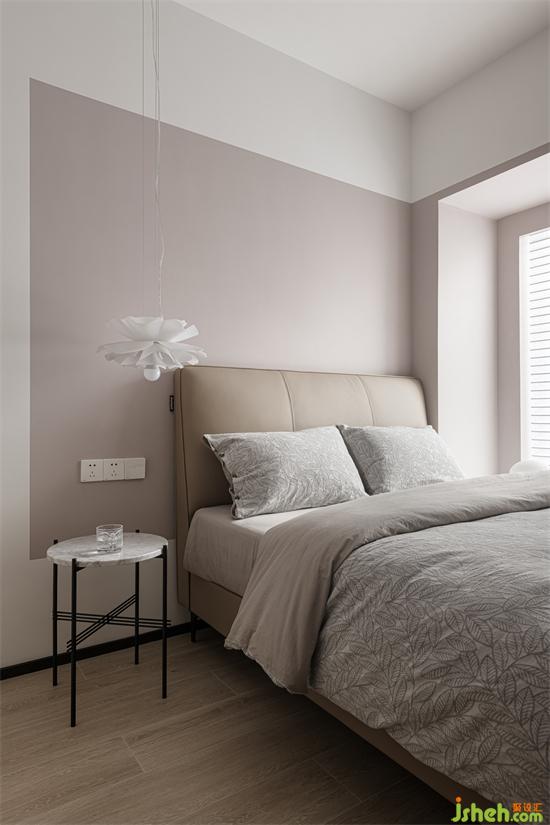 次卧利用雾霾紫的墙面,渲染宁静的安睡氛围。床头选用皮质软包,保证了休息时的舒适感。家装设计采用纤细设计的简约边几,在有限的空间内避免了空间在视觉上带给人的逼仄感。