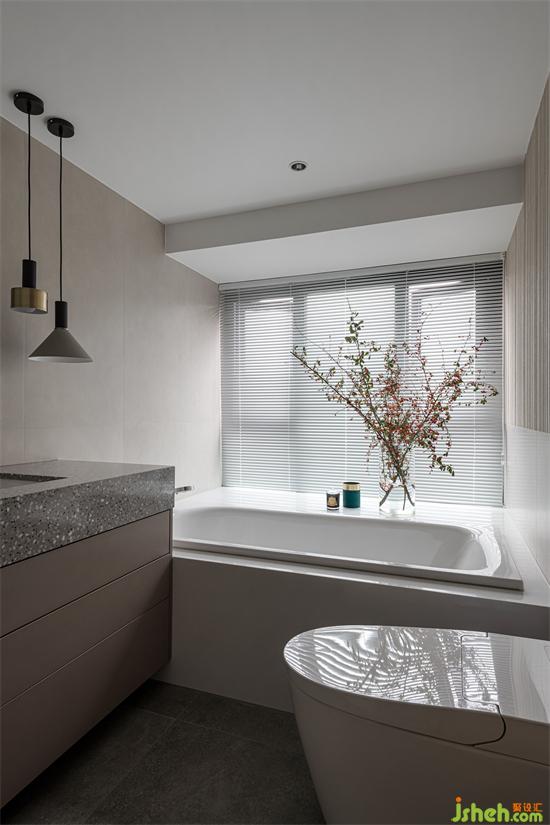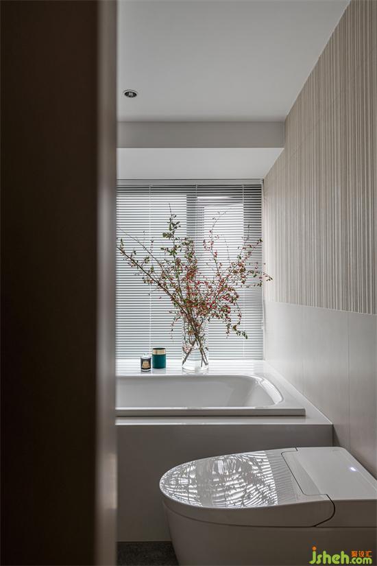 主卫亦将空间合理利用,靠窗的浴缸设计,让居住者在在家中可以尽情享受沐浴的放松,缓解一身的疲惫。家装设计瓶盏花艺的布置,清芬盈室,使整个空间清雅有致。