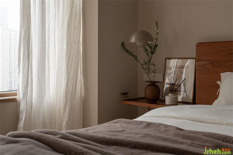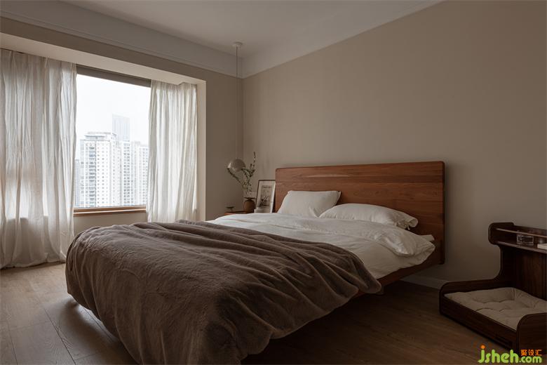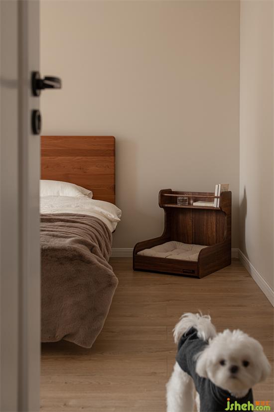 主卧采光通风良好,选用沉稳的木色,营造舒适安静的休憩氛围,同时,也与整个家的自然气质相呼应。成都家装设计将狗狗木床放置在室内,方便平时照料。