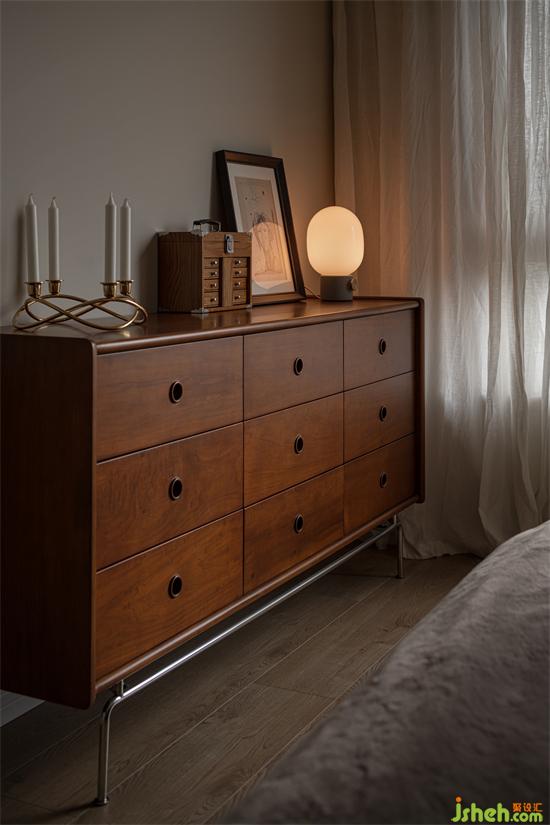 整个空间的置物遵循少而精的原则,筛选后的物品也都尽可能保留屋主的审美个性。家装设计斗柜采用深色木质与金属的组合,精致考究,自然质朴。