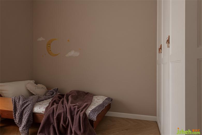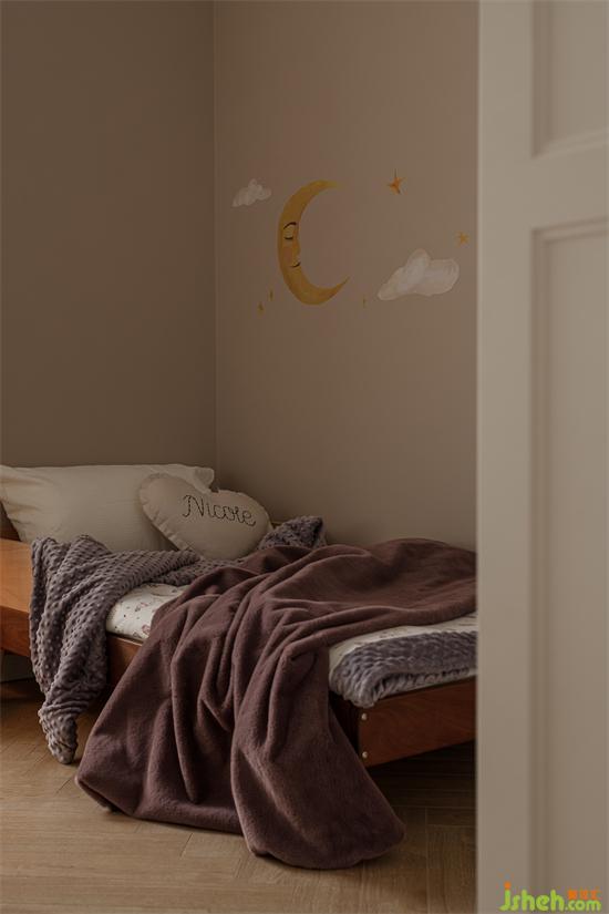 女儿房用色柔和雅静。墙壁上的月亮与云朵图案天真俏皮,沉静之外,充满浪漫的想象力,与女儿的年龄爱好相符。