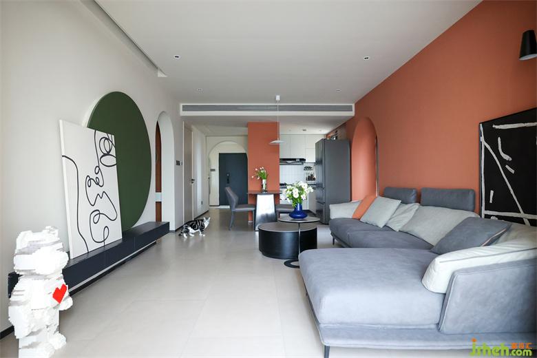 成都北斗七星城装修设计师将厨房与餐厅之间的墙体予以拆除,使客厅、餐厅、厨房融为一体,形成纵向贯通的视野开阔之景。抽象艺术画充满奔放想象力的线条,艺蕴十足。