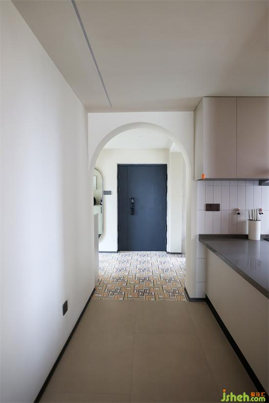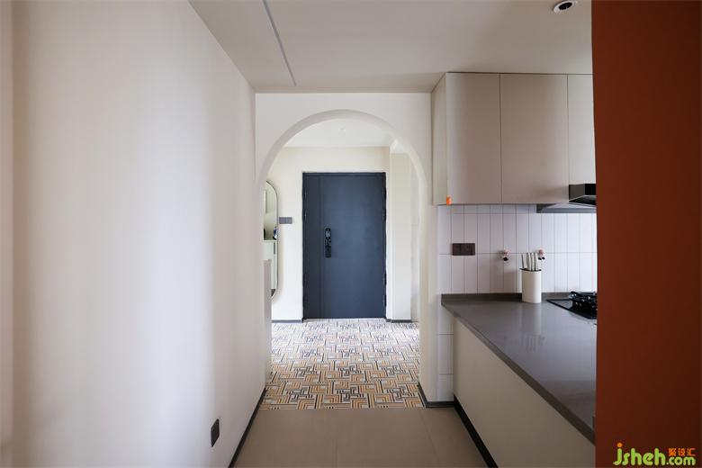 视野随空间向前延展,成都北斗七星城装修设计师将厨房原有的入口部分进行了半封闭处理,半开放式的厨房凭借操作台与走廊相连,合理利用每一寸空间的同时,增强了备餐时家人间的互动与交流。家装设计另一侧的墙柱利用遮挡关系,起了过渡与分界的作用,为空间保留了些许的神秘感。