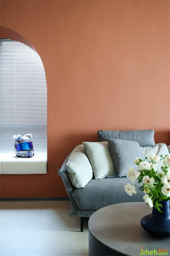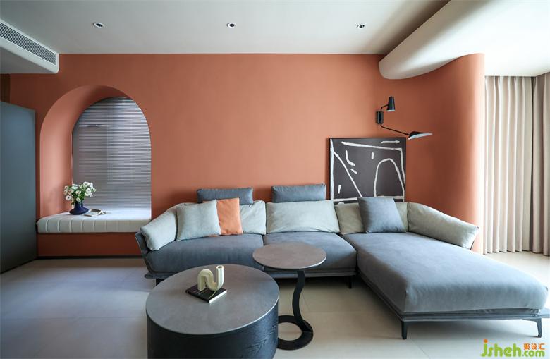 整个空间用色、造型不拘一格。整体以低饱和度橙色作为主题色调,以相对明丽的色彩,中和了灰色与蓝色的沉闷之感,营造出理性与温情并存的家。空间多采用弧形元素,勾勒出多变的层次与一丝不苟的仪式感。