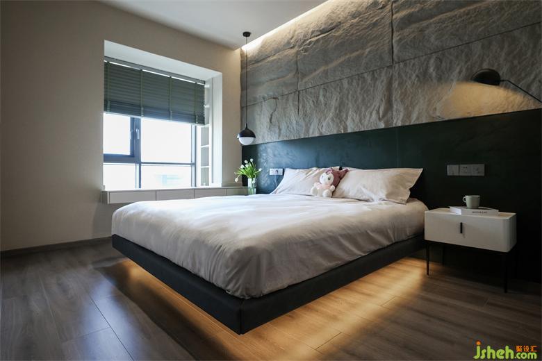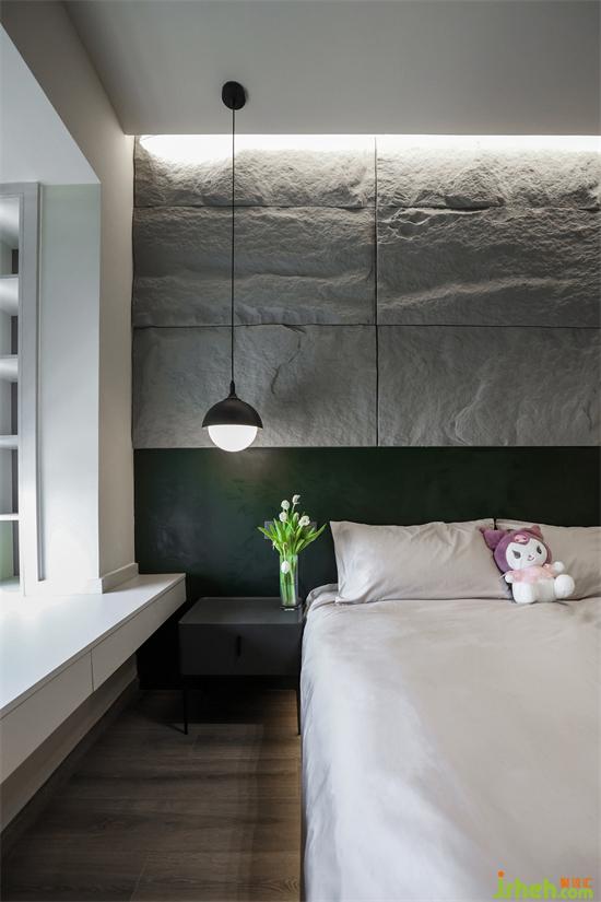 卧室拥有良好的通风采光,背景墙有着自然岩石般的理性纹理,与墨绿色结合,成都北斗七星城装修设计别具优雅与硬朗气质。