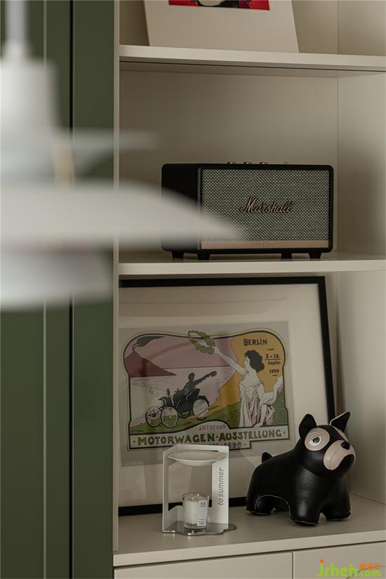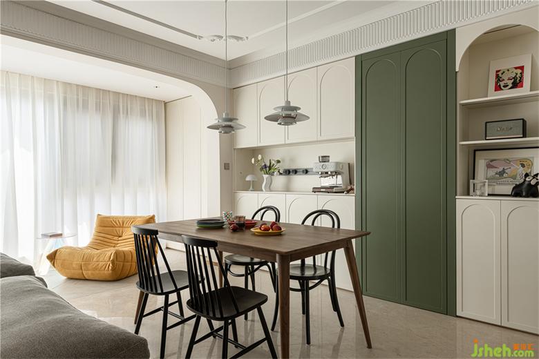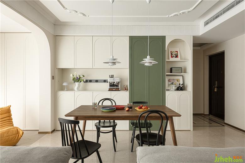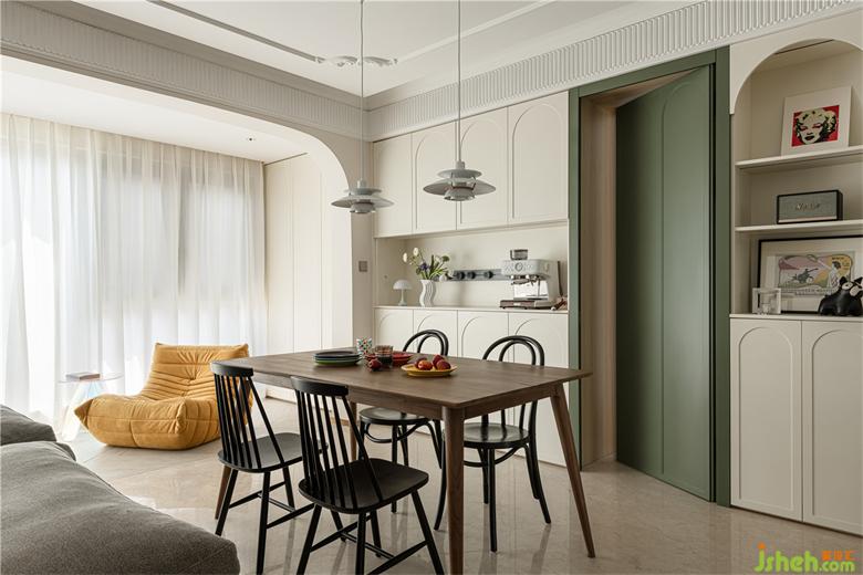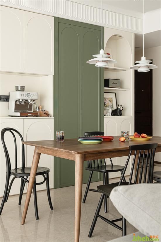 餐边柜收纳有序,奶油白与绿色的搭配显得格外温柔。餐边柜一侧连通隐形门,二者形成和谐自然的整体。奶油小法式家装设计师从画廊淘到一幅粉绿色人物装饰画作为礼物送给业主,摆放在餐边柜上与整个空间相得益彰,增添些许中古气息。