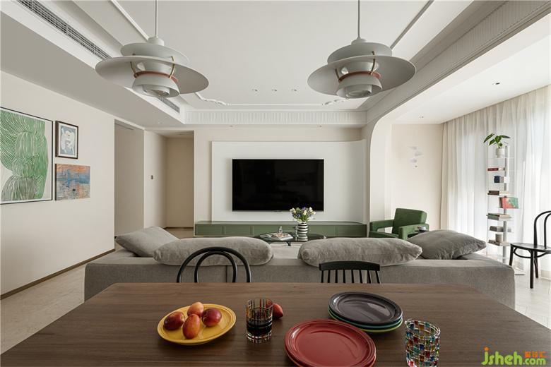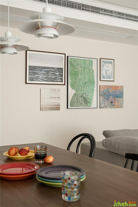从餐厅斜望过去的墙上装饰画,奶油小法式家装设计以或浪漫复古或抽象写意或自然恢宏的画作为空间增添文艺气息,透露出优雅知性的空间氛围。