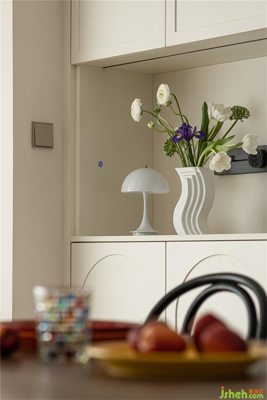 空间中氤氲着奶油白色调带来的温软与典雅之感。选用曲线瓶器呼应空间中的弧线元素,奶油小法式家装设计别具流动的动感之美。装饰的花枝,清新自然,让整个空间生机勃勃。