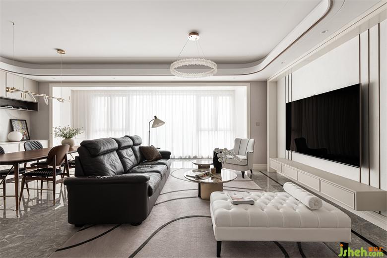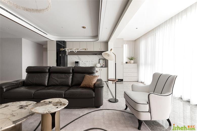 深色皮质沙发坐感舒适,独具质感,流露出粗犷的自然之美。成都中铁御花府家装设计落地灯灯罩的白色伞状形态让整个现代空间别具轻盈灵动之感。地毯上的凝练抽象的艺术线条,富于动感与活力,为空间注入艺术情调的同时,在视觉上形成一种纵深的扩展效果,使空间层次更为丰富。