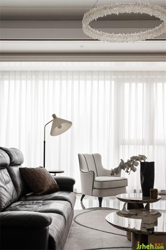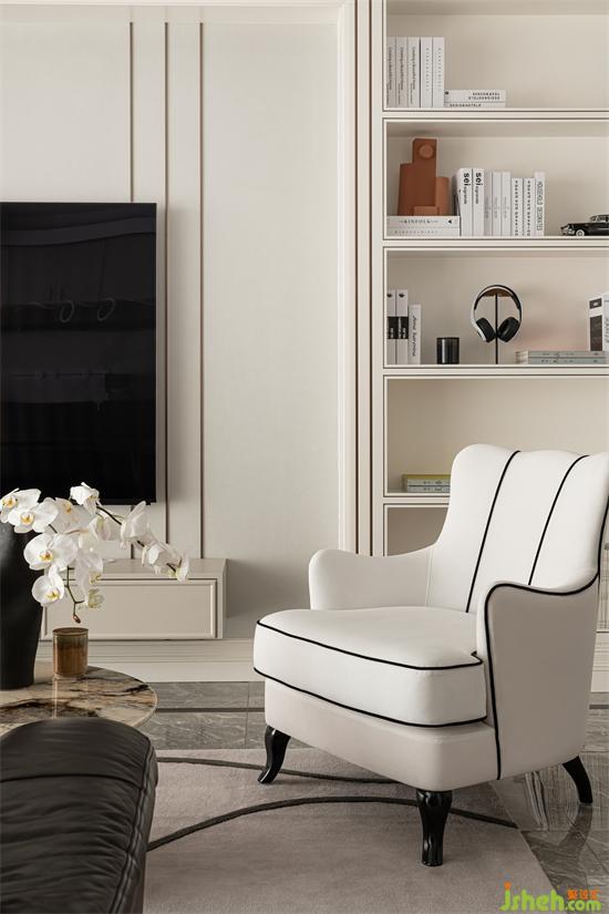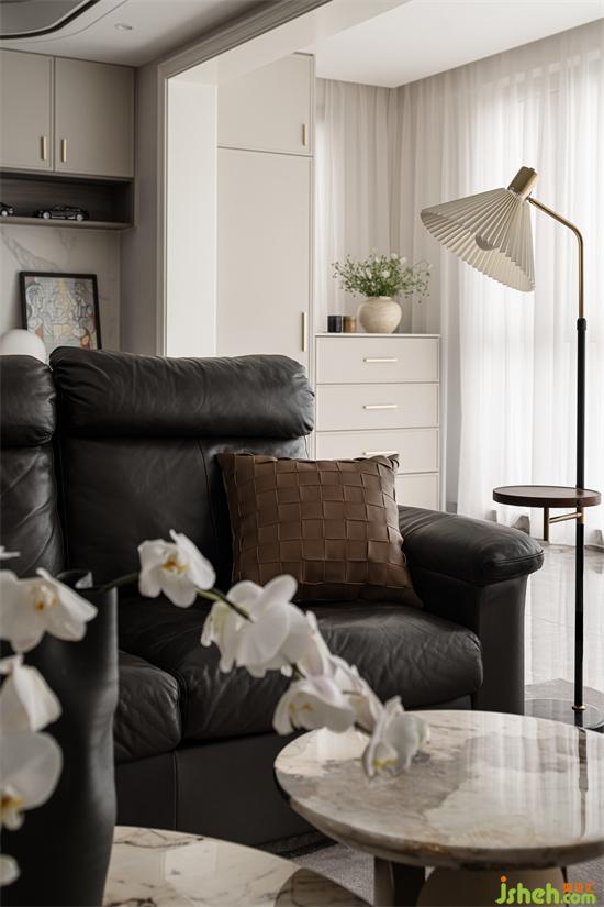 线条圆润、造型优雅的白色沙发触感柔和,增加了空间的明亮度与通透度,烘托出轻松、清新的闲逸气氛。白色的蝴蝶兰与空间主色调相呼应,饱满茂盛的花朵,柔媚清雅,为空间增添些许芬芳与活力。