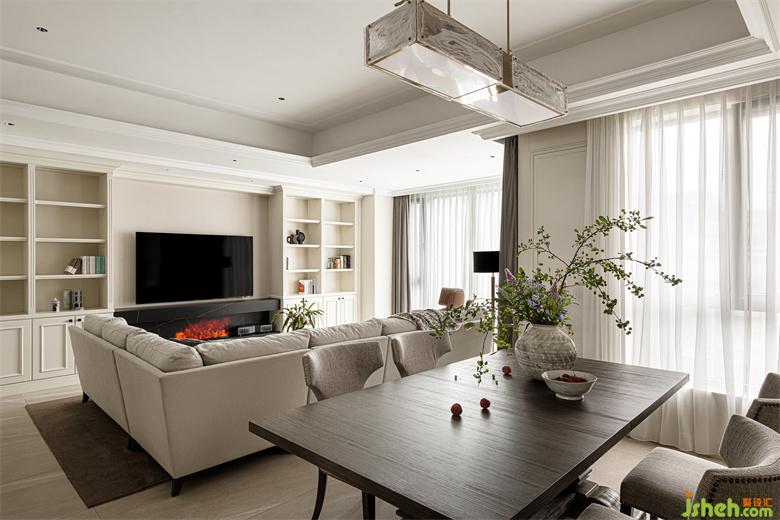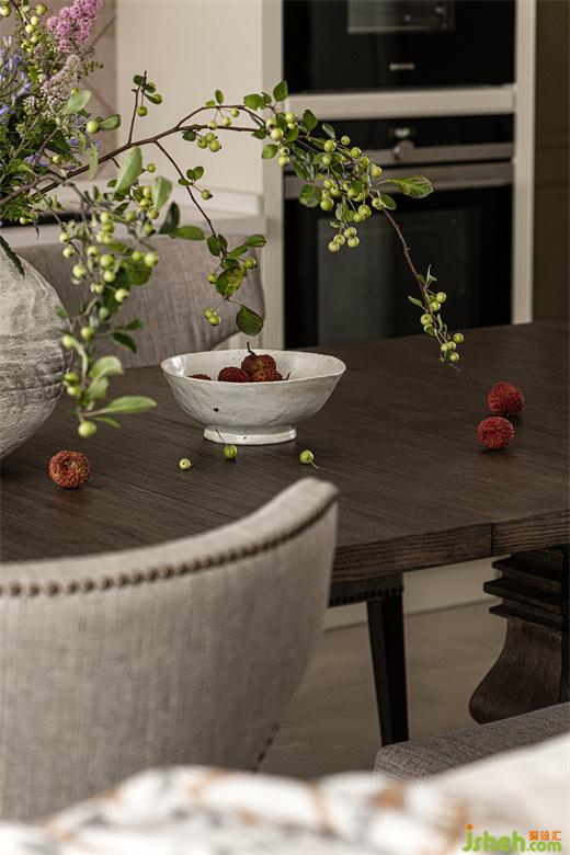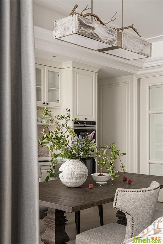 餐厅白色与金色相间的吊灯,华而不艳,上方树枝造型遒劲硬朗,渲染出整个空间的自然氛围。餐桌上古朴陶罐插满生机勃勃的枝叶与花束,为用餐氛围注入了更多的自然与活力。