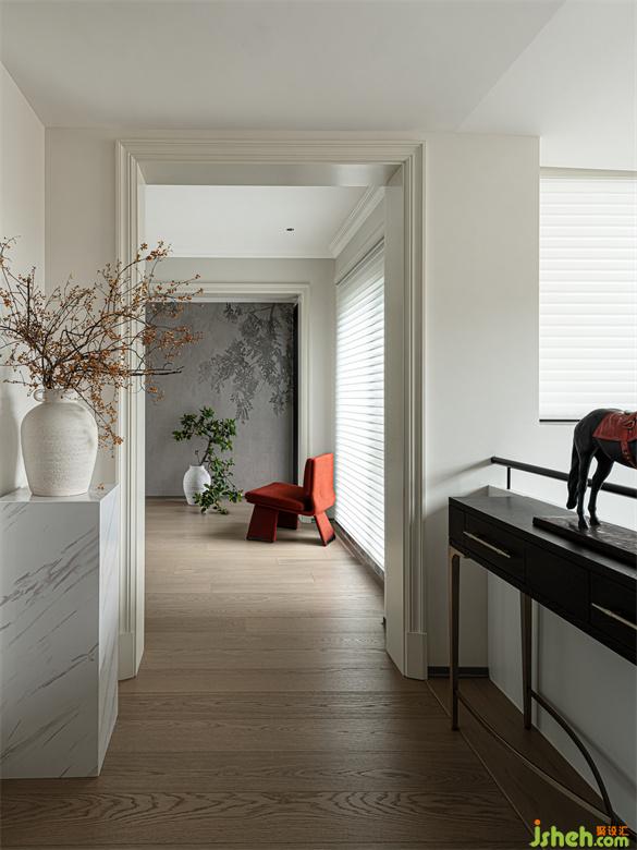 走廊一侧的展示架上,摆放着精心挑选的马形雕塑,静谧之中又包蕴着一种爆发力,为整个走廊增添了更多的艺术张力。植物的穿插渲染,葱郁盎然,流露出鲜活的生气。
