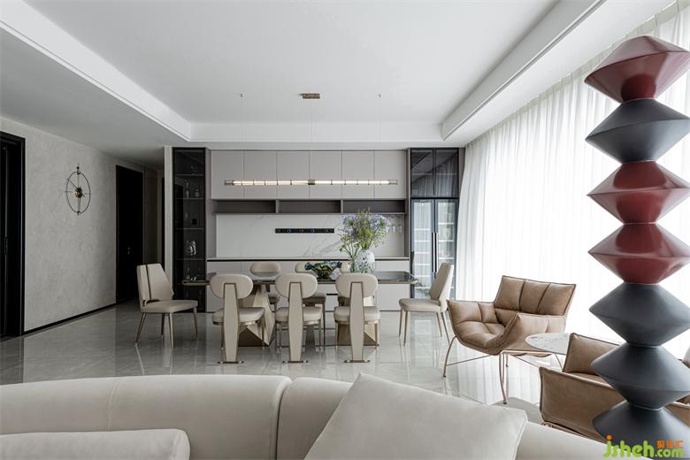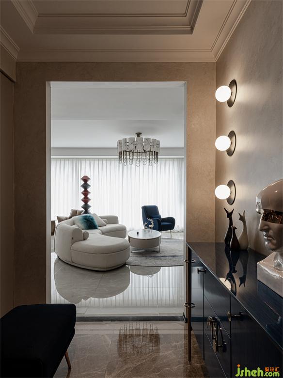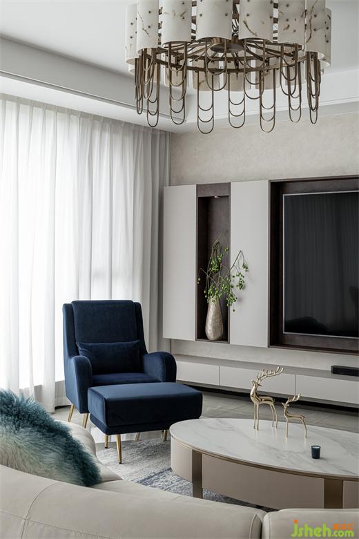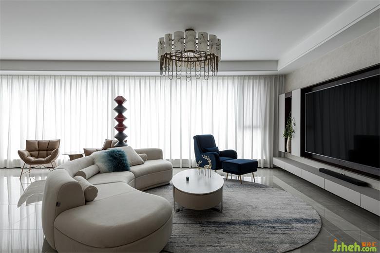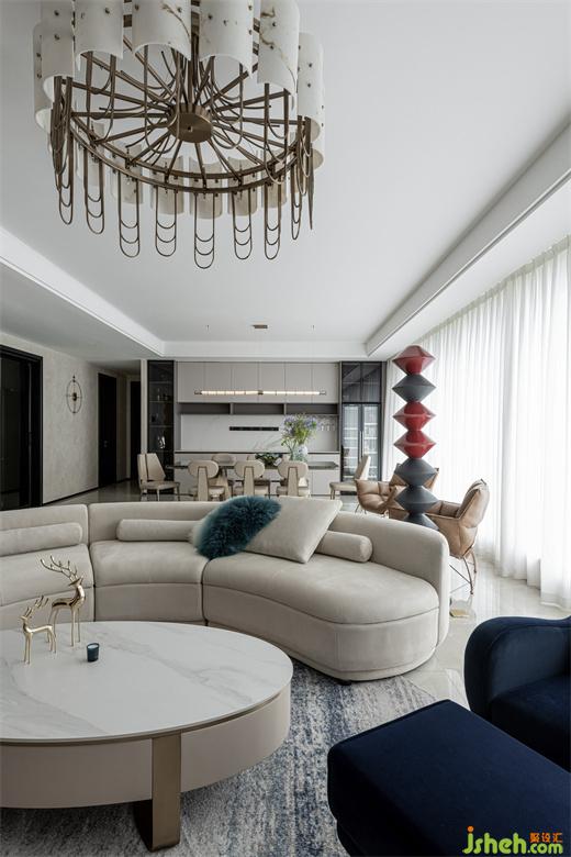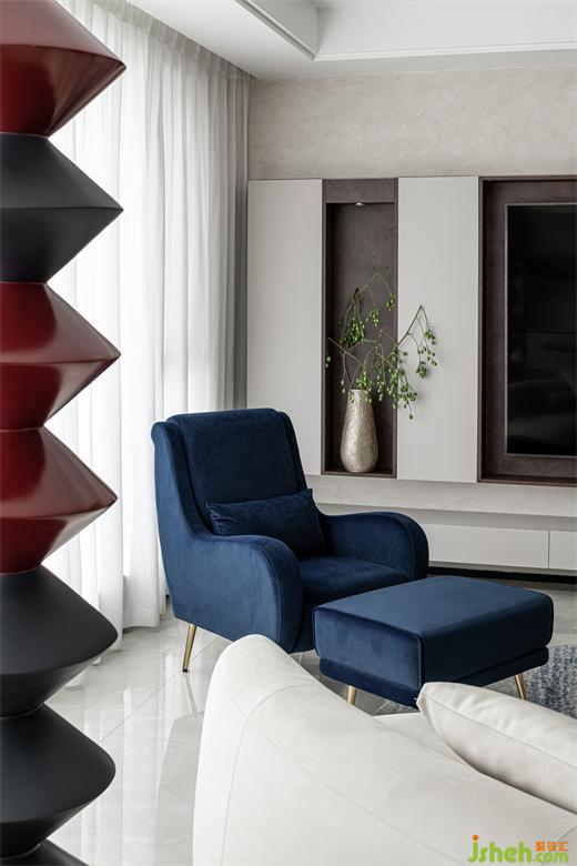 树立在客厅的立体几何雕塑给空间平添些许艺术气息,与整个室内环境形成一种和谐共生之美。蓝色晕染的抱枕与沙发椅、地毯的色彩相呼应,为整个空间注入一些亮色,散发出精雅独特的浪漫意趣。