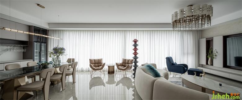 整个空间视野开阔,明亮通透。客餐厅贯通的动线,使得日常休闲活动极为便捷。家装设计空间以黄、白、蓝为主色调,营造出轻奢典雅的气质。