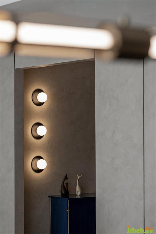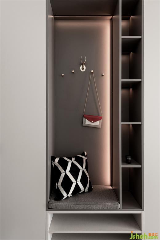 入户玄关处巧妙运用灯光,通过墙壁氛围灯晕染的光线来营造空间的明暗层次,家装设计打造一种温馨的情调。柜体灯光除了突显柜子内的物品以外,呈现出独特的光影效果,在视觉上扩展了柜子的空间感。
