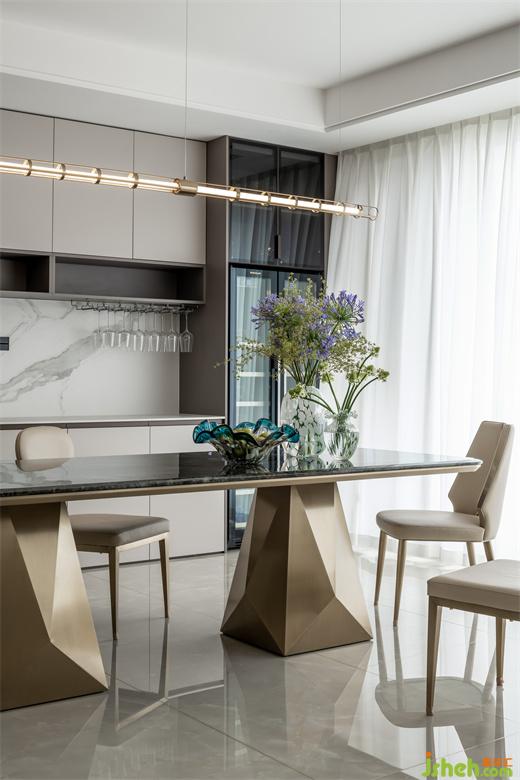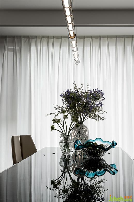 桌面装点着瓶盏花枝,清新芬芳,家装设计打造出自然而富有生机的用餐氛围,别有一番清雅韵致。