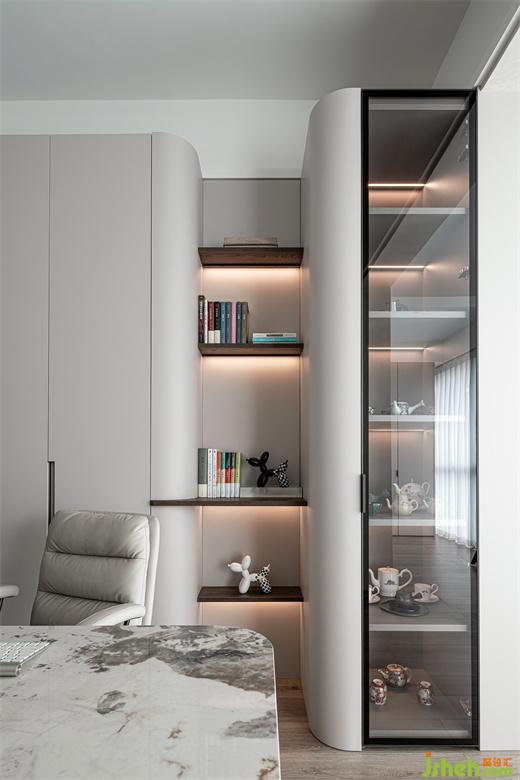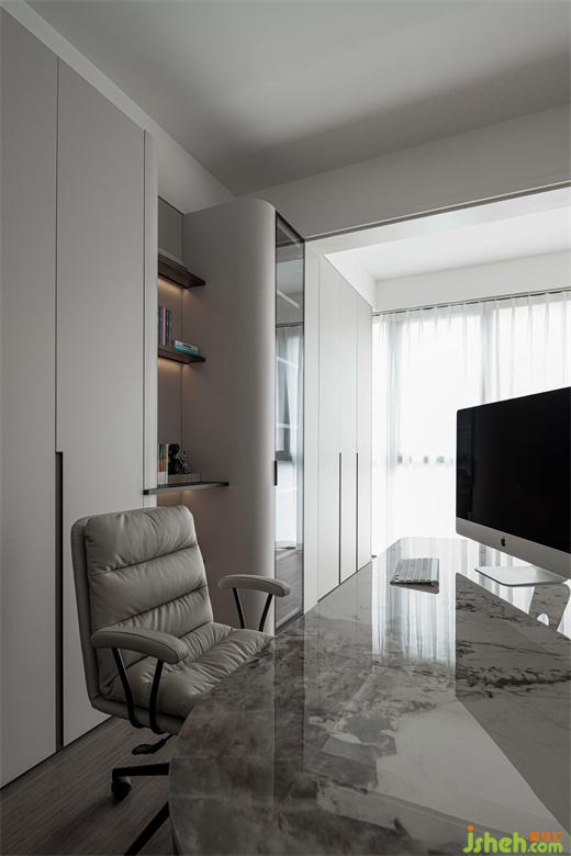 书房以淡雅的灰色作为主色调,给人一种温暖平静之感,温润的弧度更增造型之美。宽大舒适的书桌放置在房间中央,加上一把柔软的靠背椅,为人专注的工作学习提供了理想的场所。