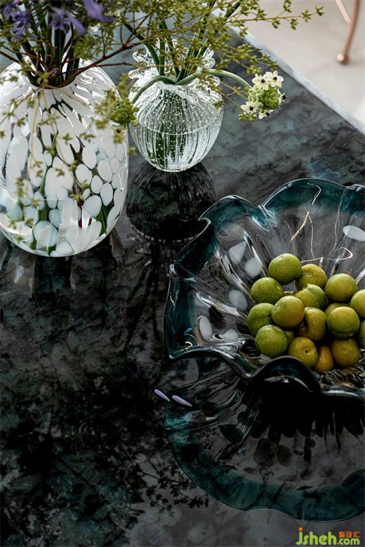 紫色的花束与绿色的青李,在视觉上给人一种清爽之感,丰富的色彩与香气让空间变得轻松愉悦起来。