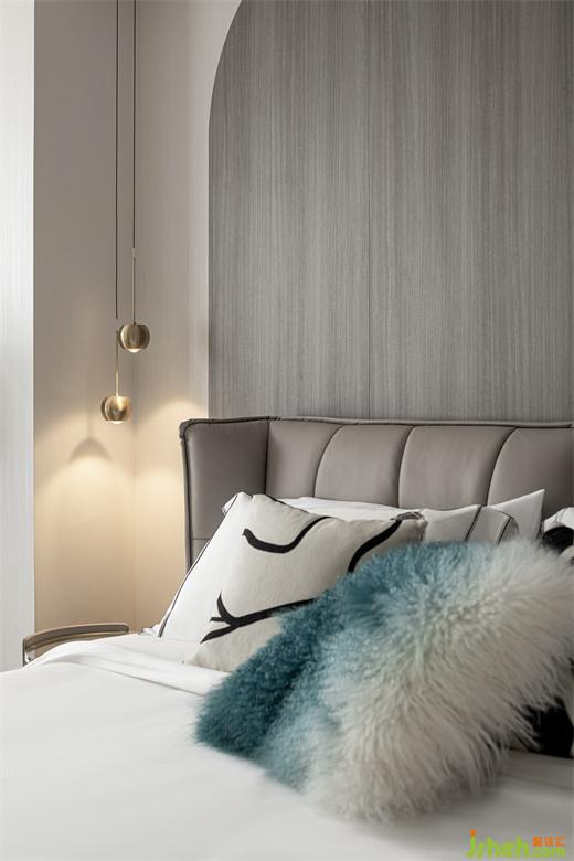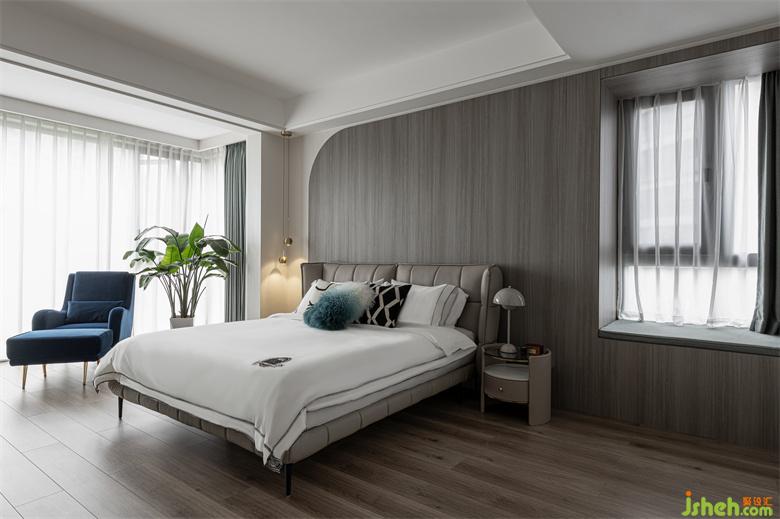 主卧空间明亮开敞,让人步入其中即有一种视觉上的放松感。主卧的背景墙采用木质弧形设计,纹理细腻,颇具质感。