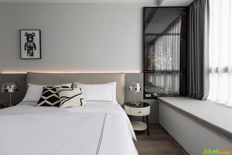 背景墙以灰色的深浅进行过渡,背后温馨的灯光为舒适的休憩提供了绝佳的条件。黑色玻璃展示柜中陈设着居住者喜欢的乐高积木,家装设计凸显着其独特的个性爱好。