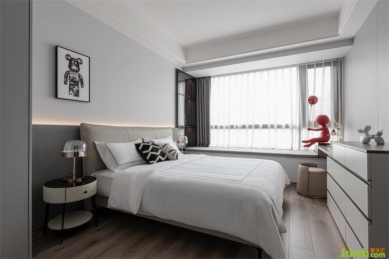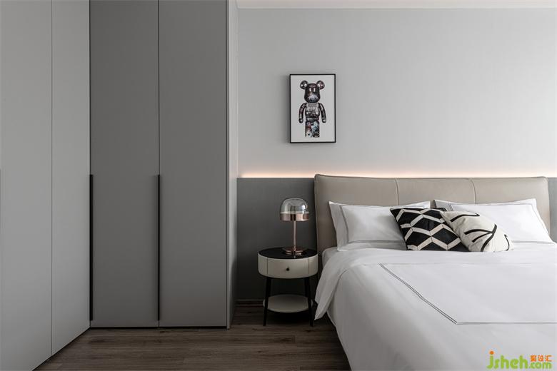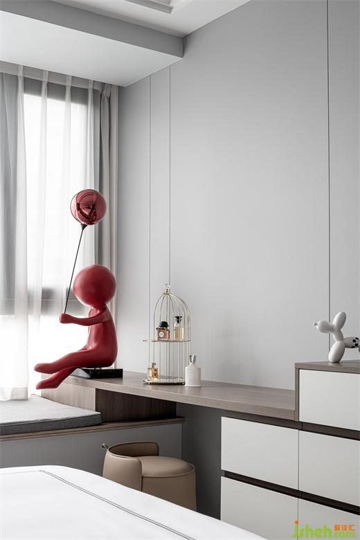 儿子房在极简的格调之下,又充满着想象力与趣味性。内敛稳重的灰色,家装设计打造出静谧安然的休憩环境。俏皮的艺术挂画与雕塑摆件让整个空间都充盈着新鲜的活力。