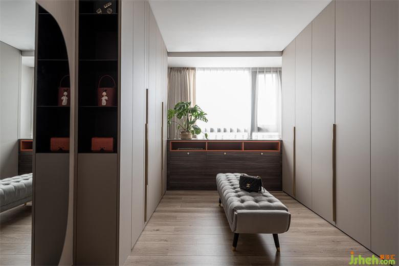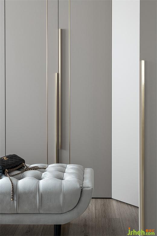 衣帽间遵循着极简设计原则,家装设计将收纳利用到极致,整洁有序,金色的把手点缀既呼应了空间的轻奢调性,又极具美观性。