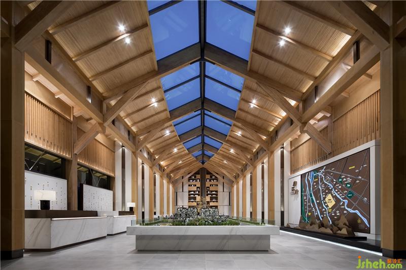 都江府销售中心受中国传统木建筑结构启发,建筑主体将木结构、现代工业以及现代人的功能需求做了耦合,以一种简单谦逊温和的姿态立于大地,倾听山语。园林以水之势布局,写意枯山水优雅静谧。形似川西民居的双坡顶建筑有一种视觉上的轻盈感和亲和力,中国传统建筑空间所注重的室内外的相互渗透和交融,让置身其中的人感受到宅与院,室与景是一个不可分割的整体。装修设计