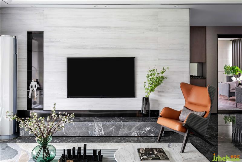 金属与大理石是很好的艺术伙伴,它们总是能让空间的品质和价值提升一个层面。如果白色是主大调,那么咖色就是小音阶,金色勾略出白色的优雅,宛如置身于维也纳伴着华尔兹的步伐,优雅迷人。样板房设计