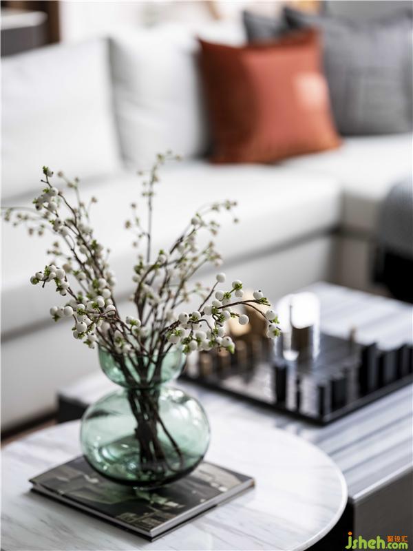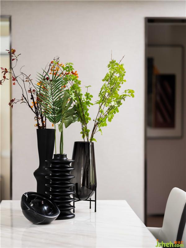 餐厅转身就是厨房,设计师将它设置为半开放式,显得独立而又宽敞,同时让厨房、餐厅、客厅连接在一起,使用每个空间的主人都有很好的联系与互动。样板房设计