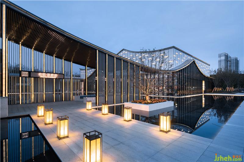 设计师从徽派建筑的瓦当这个传统的建筑构件中提炼出其形,结合了建筑的人字形设计,采取了比较柔和的连续弧形‘人’字形屋顶结构,形成一个整体。