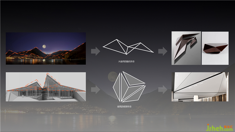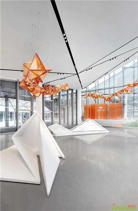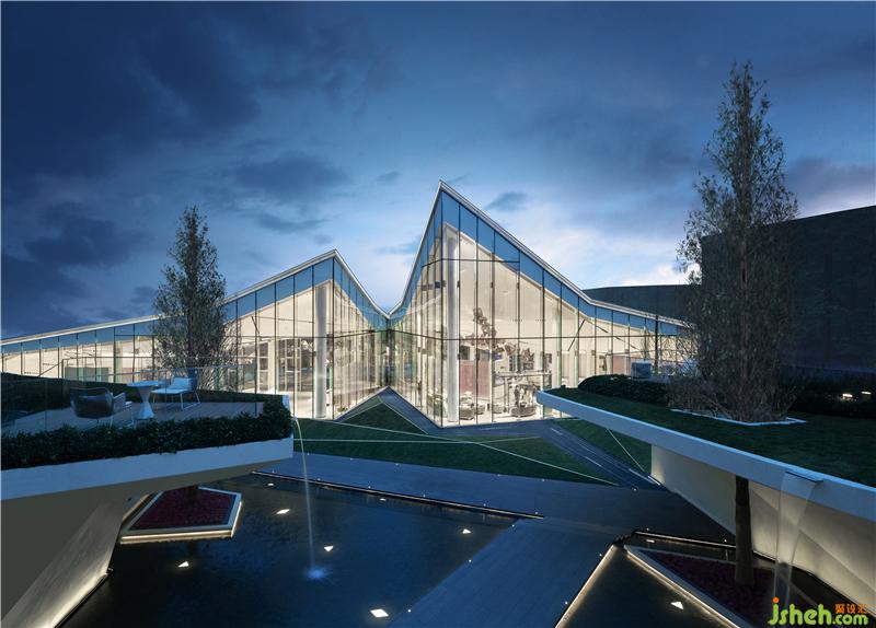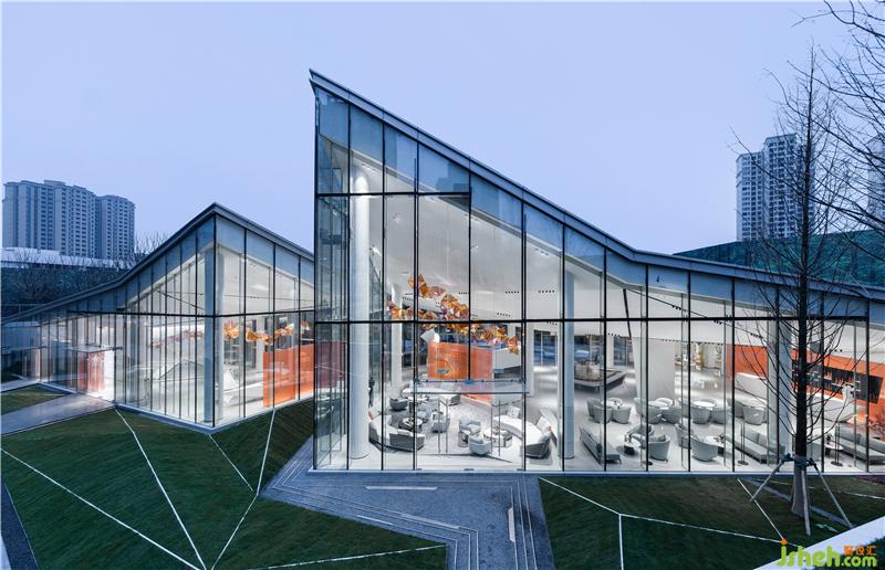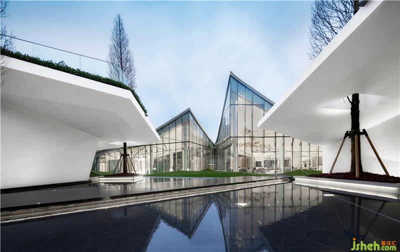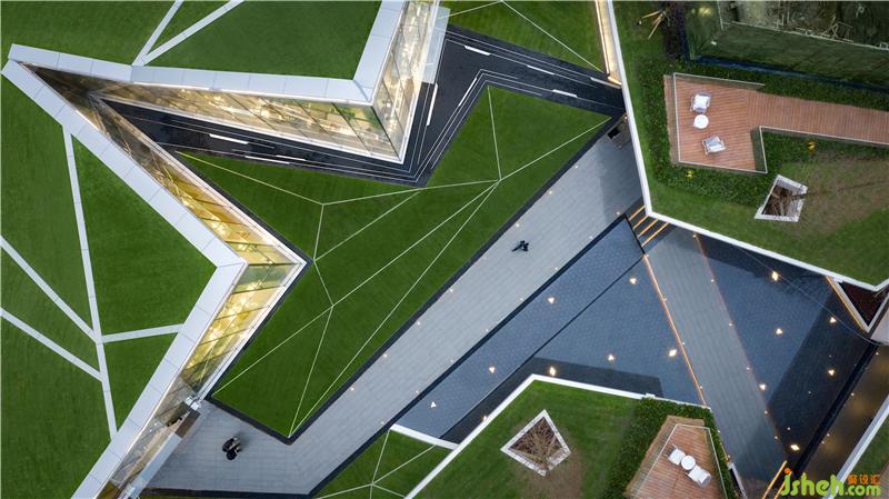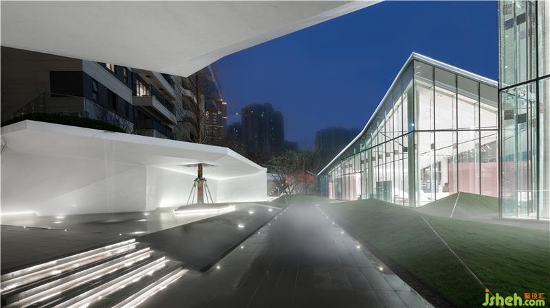 因循地势地貌,建筑外观极具特色。依地势下沉,又如山之形,似破土而出。从入口进,经阶梯往下步,途遇水榭,建筑屋顶与小区外路面齐平,屋顶种植草坪,从高处俯瞰,形隐于绿色的植被和水景之间。夜间,室内灯火如皎洁月光,建筑外形似远处斜山,一抹暖橙色,如晚霞余晖,指引归家的行人。
