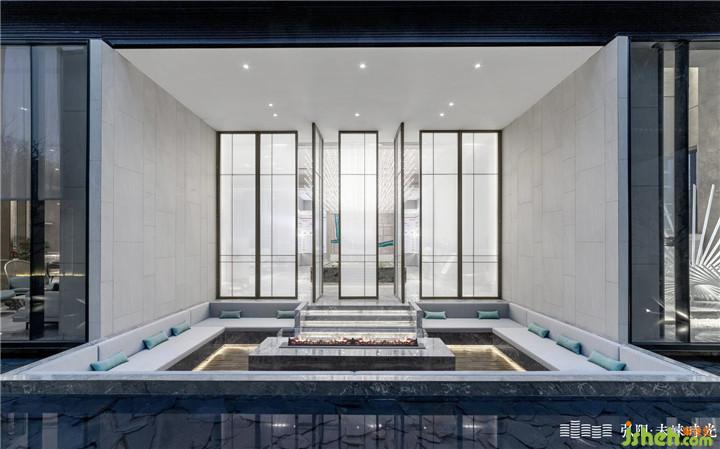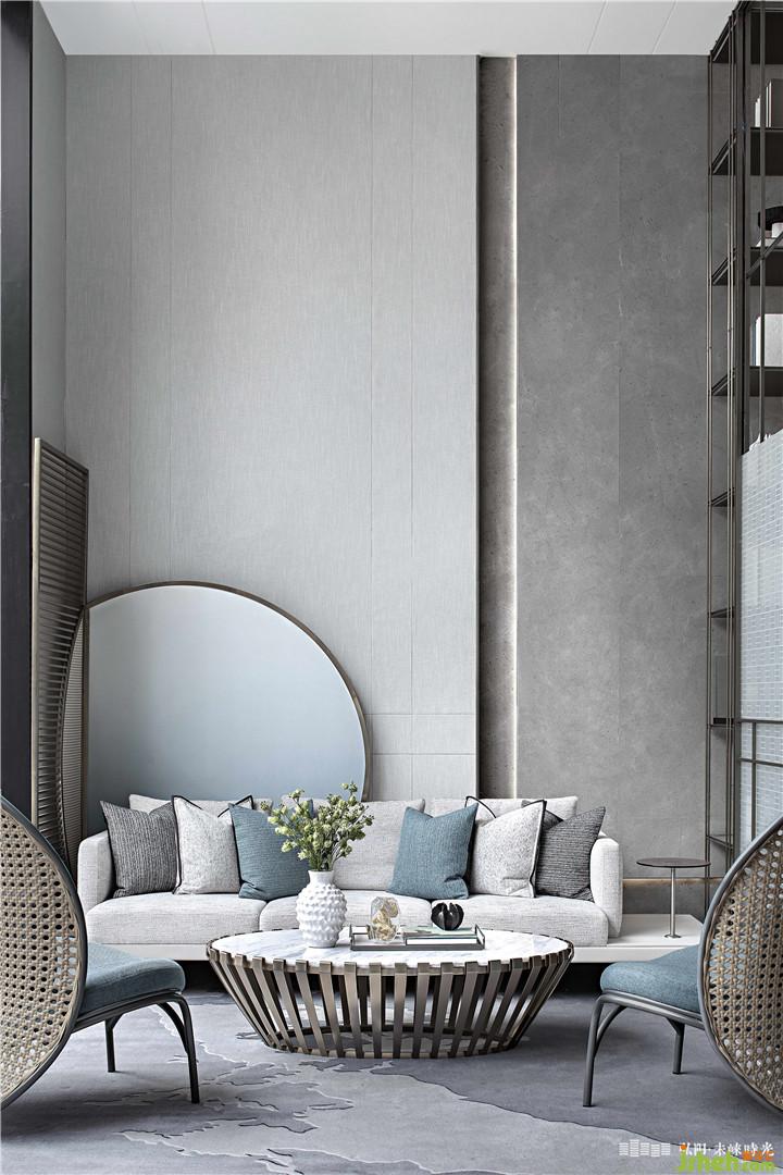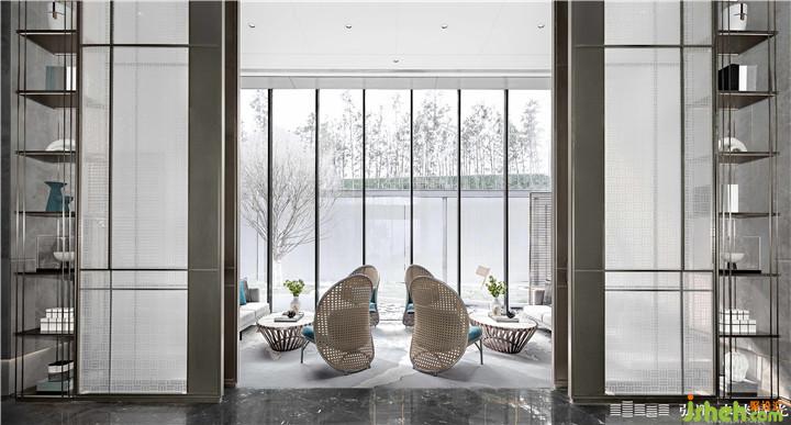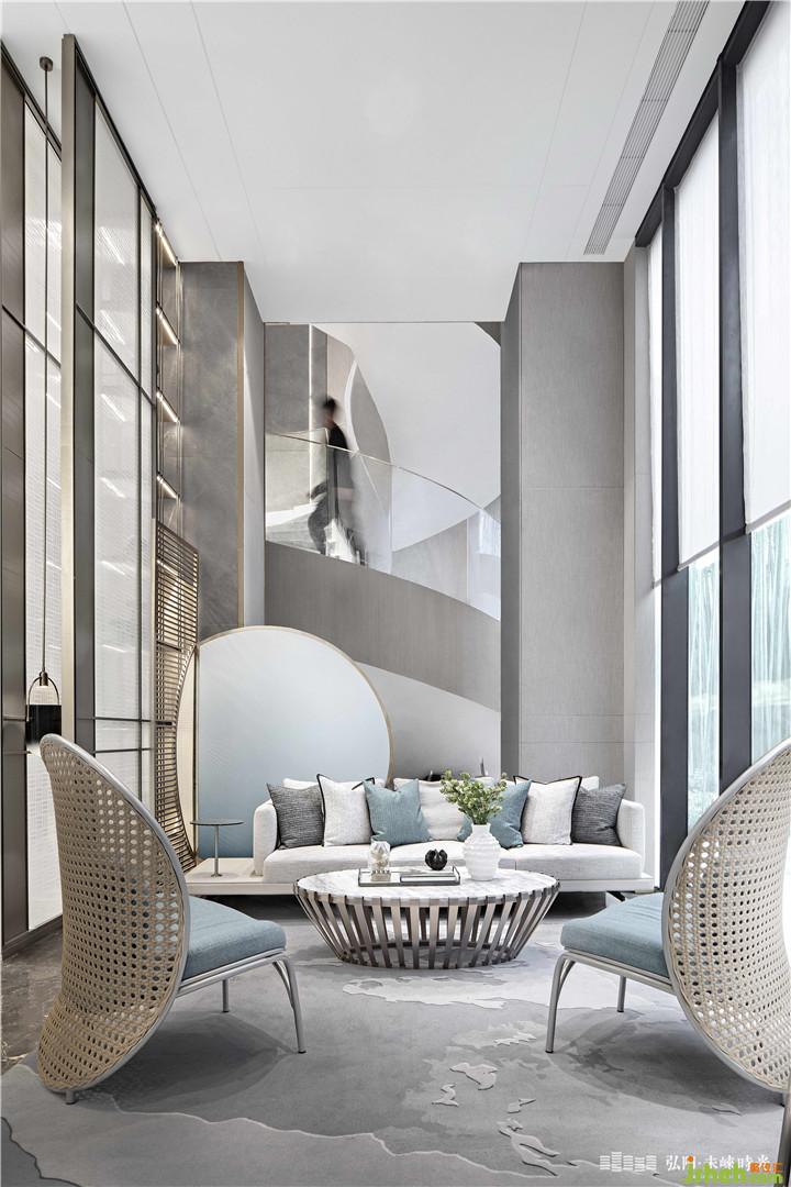 “风吹竹叶休还动,雨点荷心暗复明。”沙盘上方簌簌竹叶,风过可闻沙沙声。沙盘左侧可通往户外水景区,至嵌入式水景的静心休息区坐下,便是一方令人沉醉的小世界,眼前翠竹绿水,脑海里无他,拾得一刻理想生活。窗里以竹编织生活艺术,将竹印记刻于墙上;窗外竹林栉风沐雨,壮志凌云,演绎东方田园诗格律之美。洽谈区呈对称格局,通过艺术屏风的序列勾勒空间,强化空间的仪式感,彰显理性序列之美。艺术屏风取意竹编的形,通过夹丝玻璃体现,更多了一份灵动、悠久。空间笔触洗炼,配色简洁,金属与木纹在高级灰的基底中作为勾勒点缀,表达出人文气度与品质感。室内园林小品作为空间分区的起点,起到引导动线的意义,也在动与静之间,写下一个优雅的提示信号。售楼处设计