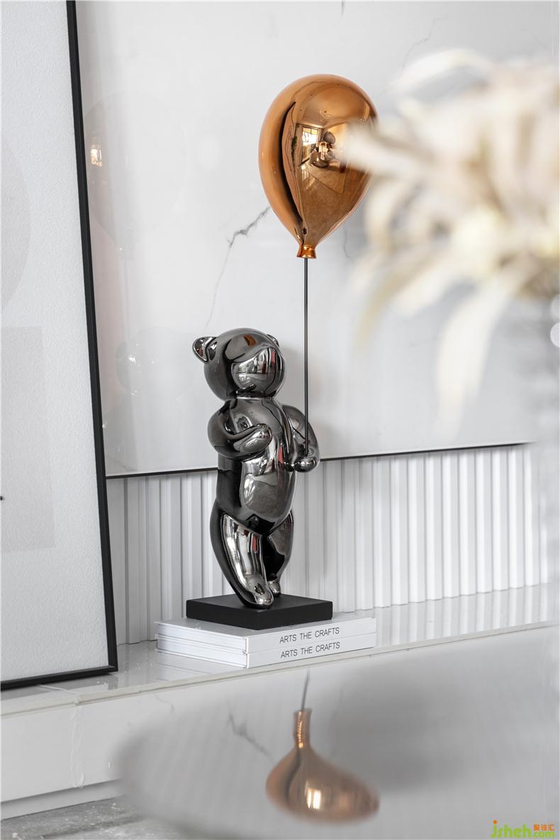 客厅整体主色调以极简白为基调,不同材质软装饰品组合,呈现出空间细腻的层次。沙发背景墙面装置物,融合天空和碧水的色彩,将心灵的目光投向天空和海洋,目之所及尽是静谧、悠闲、缓和、平静和安宁。镜面泰迪熊潮玩摆件,将空间折射变形,犹如进入哈哈镜中,唤醒居者童真,激发童趣样板房设计