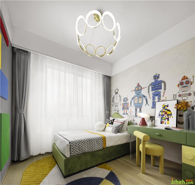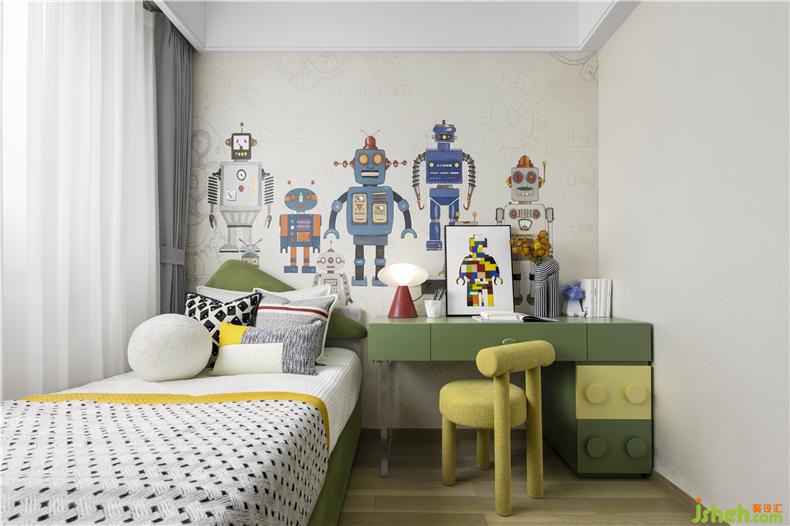 乐高积木一直是儿童喜爱的玩具,儿童房从儿童的喜好为切入点,运用黄色和绿色为主色调打造一个小小的乐高王国,乐高积木形态的书桌尽显童趣,乐高墙又增添了几分亲子互动的快乐。