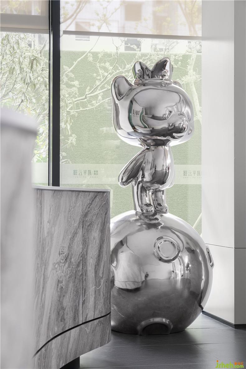 落地窗引入明亮的自然光,为室内包裹上一层柔和的轮廓。金属材质的小熊已经等候许久,笑意盈盈,向人们发出邀请