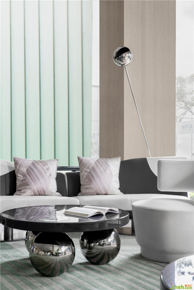 光线穿过绿色通透的亚克力,投在灰白相间的布艺沙发上。仿佛置身林间,一抬头就能感受到洒在林荫中的点点阳光