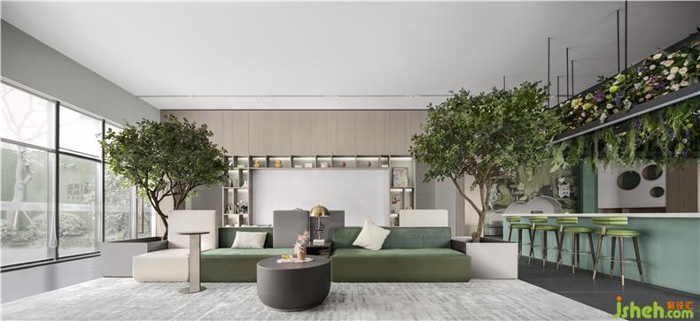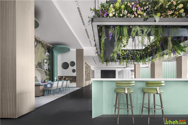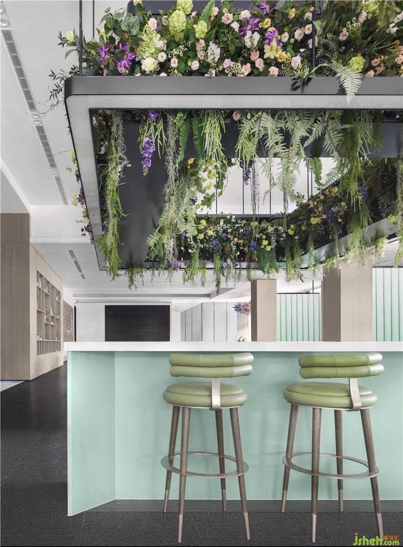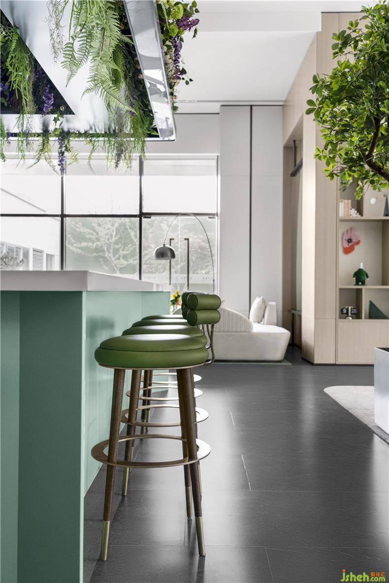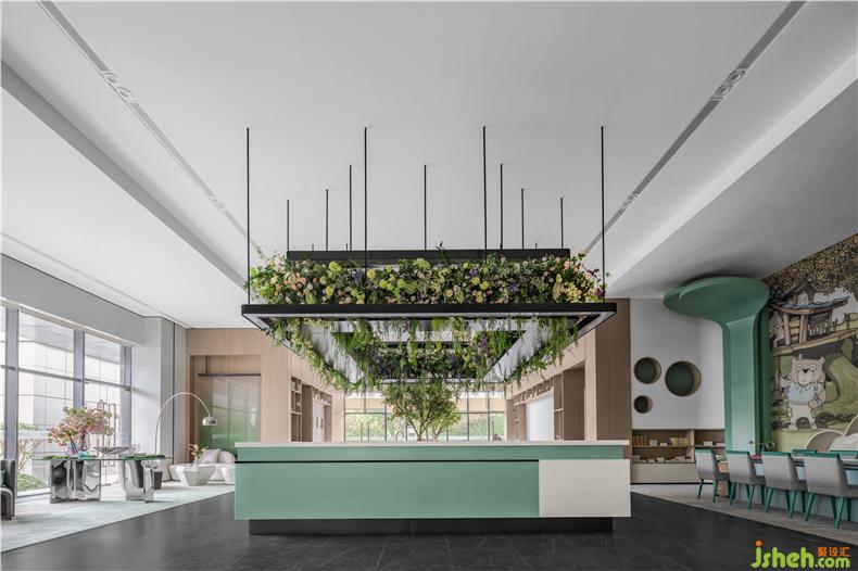 共享厨房采用独立体块模式,售楼处装修设计绿色烤漆材质吧台与绿色水磨石地面将其从整体空间跳脱出来。垂落下来的繁花与蕨类,随风轻轻摇动