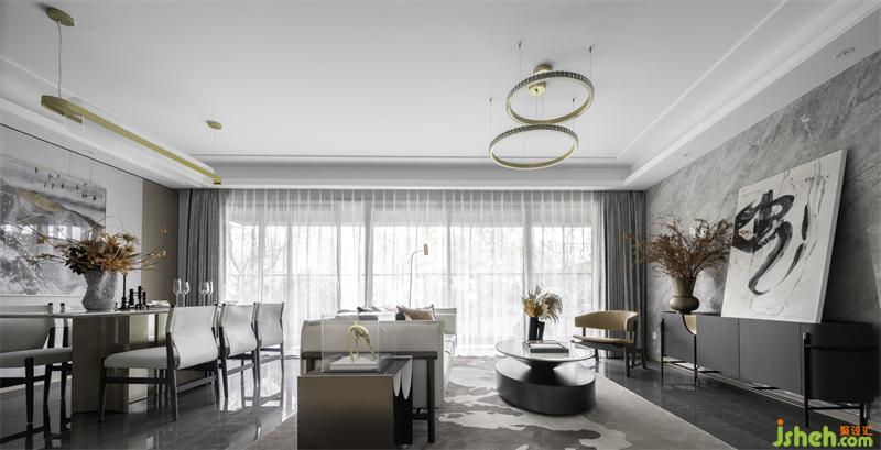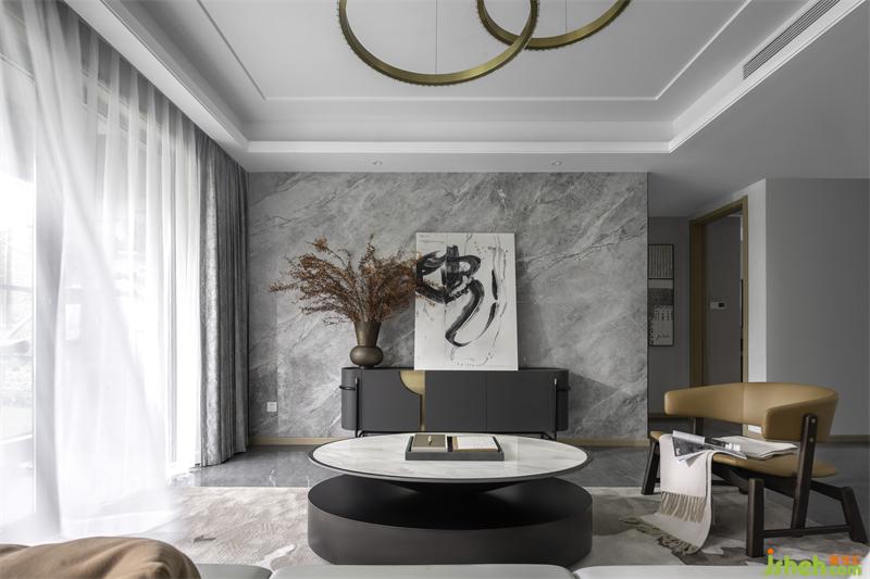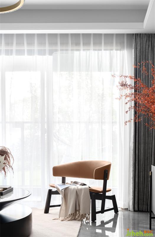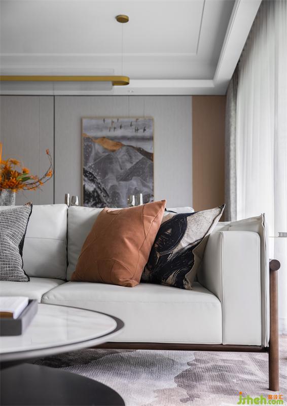 The 125-square-meter space is a combination of rich autumn and modern lines, with pale grey as the basic tone and fresh orange texture as the embellishment. The overall vision is transparent and simple.