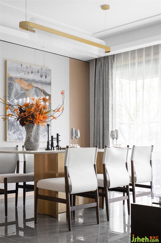 餐厅一直是中国家庭的居心地。素色的餐桌椅搭配造型别致的金属吊灯,样板房设计为这个畅谈相聚的区域加入现代的美感。