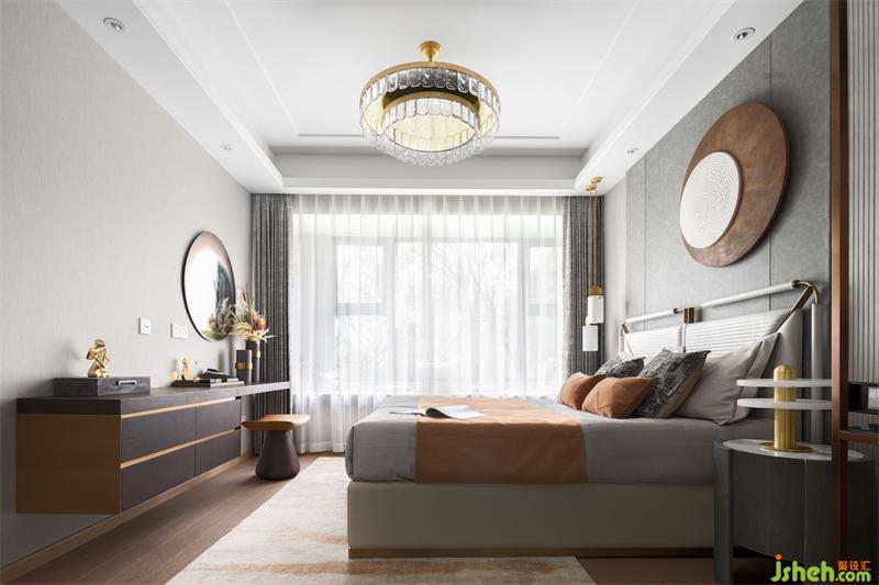 在灯具的选择上,水晶的温润柔化了金属的冷冽。让主卧整体软装柔中带刚,简洁却不单调。空间中色彩与陈设的平衡得益于材料的互相补足与映衬。