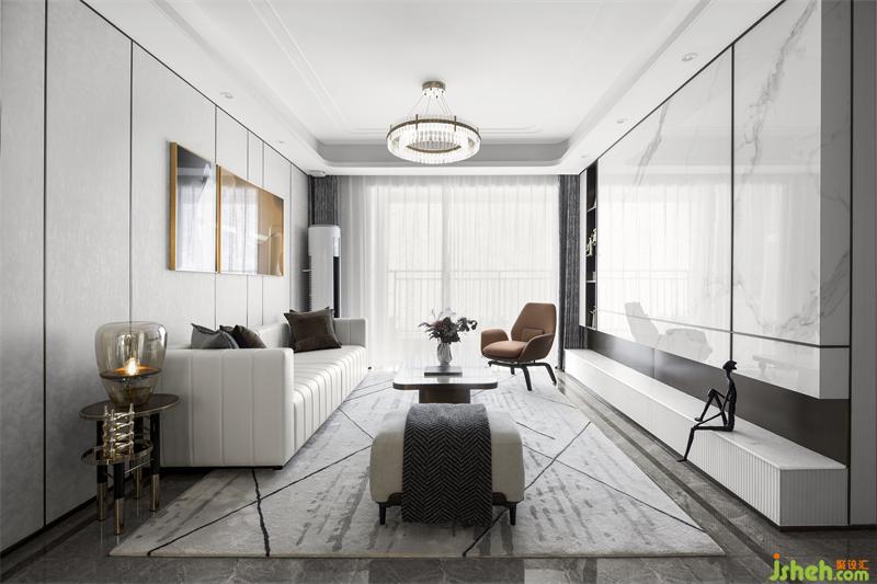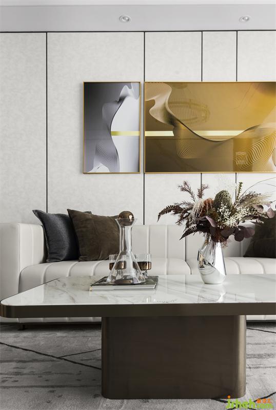 素雅轻奢的皮质沙发、光泽柔和的大理石台面、现代风格浓厚的挂画,样板房设计串联描摹出现代精致客厅空间的准确画像。
