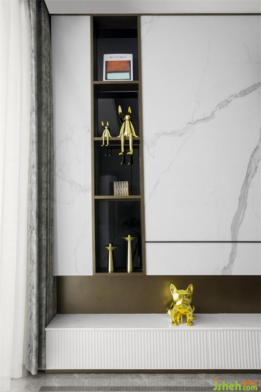 寥寥几件金属摆件,就能让空间色彩对比更加鲜明。样板房设计亦能从侧面表现业主年轻而活泼的审美。