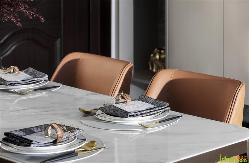 大理石餐桌、棕色皮质餐椅与客厅配色遥相呼应,强化了室内空间的统一感与精致感。