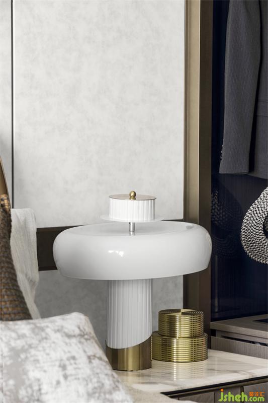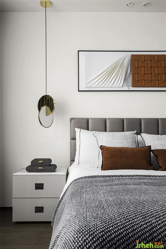 床头挂画的皮质光泽与纸质纤维的纹理,样板房设计与亚克力材质的床头灯共同表现出丰富的层次。