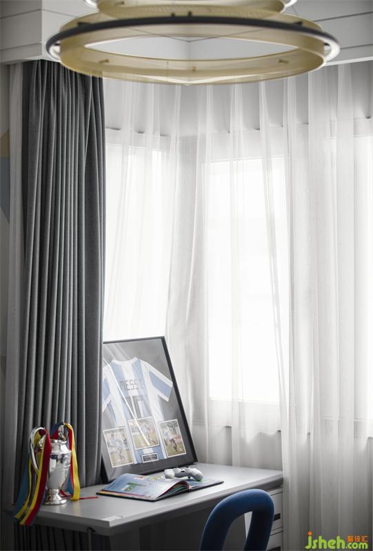 儿童房的设计,运用清爽的蓝色与各式各样关于足球的摆件,样板房设计草绿色的地毯就如足球场上的草地。