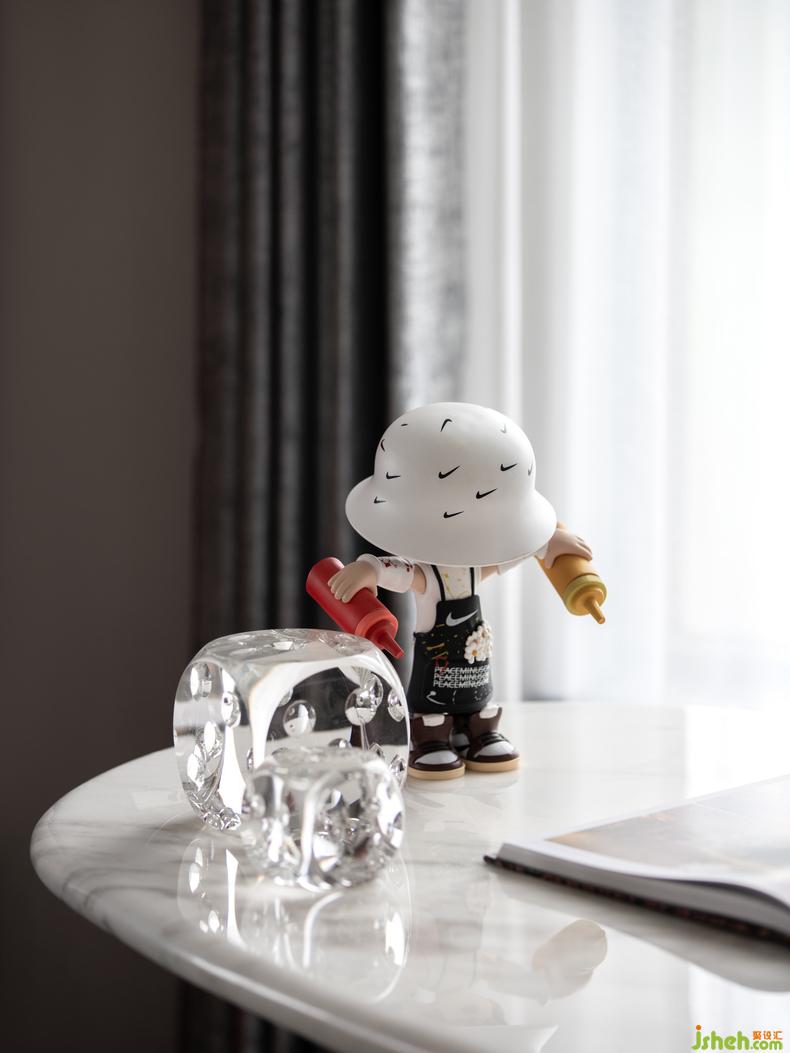 远离尘嚣的静谧之地,也需要细节上的刚柔并济。流动的银色、造型别致的潮玩,是造型艺术与潮流艺术的默契合作。